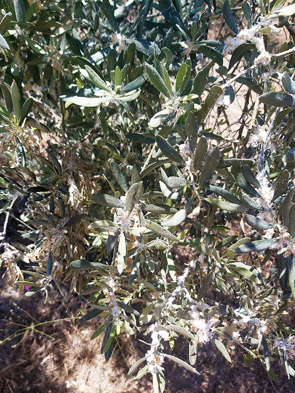 Auch der Wattebefall wird wohl die Ernte negativ beeinflussen. Insbesondere wenn die Bäume wenig Blüten tragen, wie es dieses Jahr der Fall ist, ist es wichtig, die (Olivenbaum)laus zu bekämpfen.