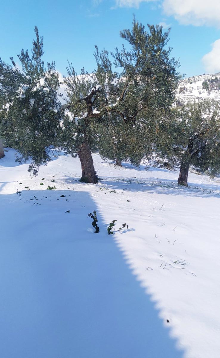 Dieses Jahr sieht aber ganz anders aus! Das Unwetter “Elpis” [Hoffnung] zog mit voller Wucht über Korinth und bedeckte die Haine mit Schnee! 11 stolze Zentimeter hat es geschneit; das ist nicht wenig für eine der regenärmsten Regionen des griechischen Festlandes! Und es ist auch richtig kalt geworden mit Temperaturen von bis -10 °C, die sogar über mehrere Tage angehalten haben.