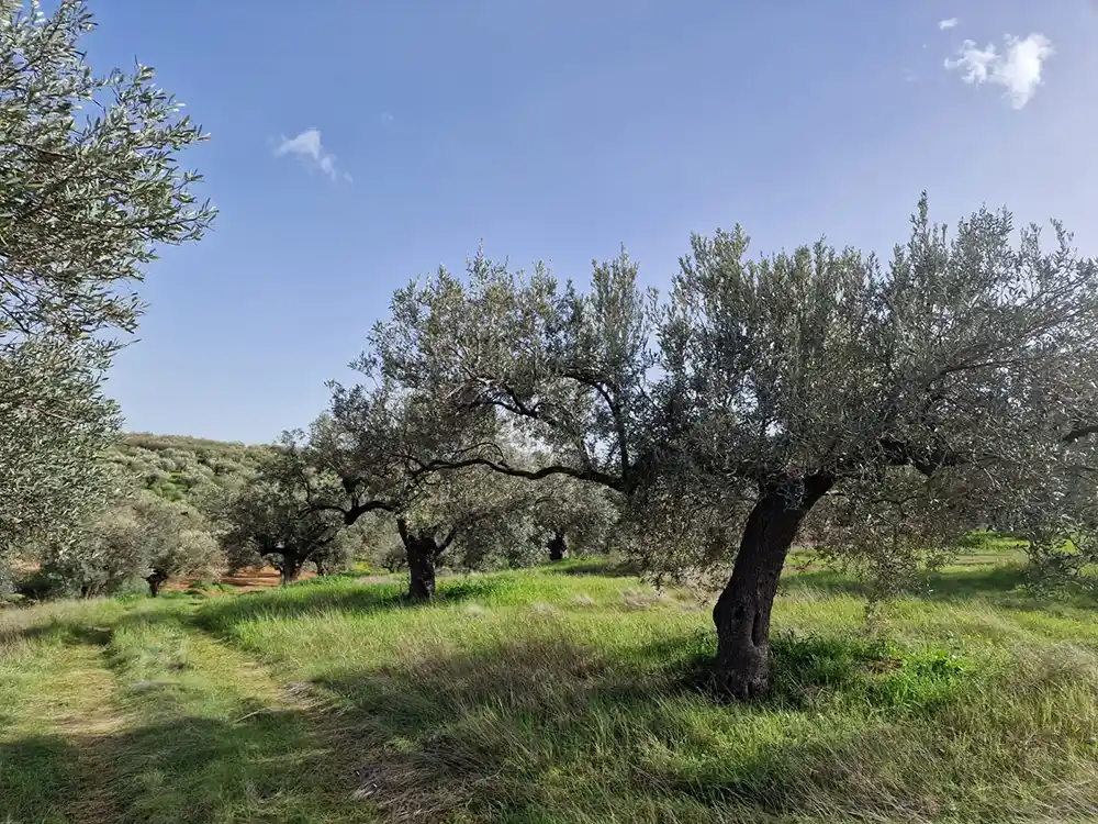 We began with a walk through the burnt olive grove at “Bogdani,” where we observed the remarkable recovery of the trees and spoke about the resilience and unique nature of the olive tree. We then continued to the beautiful “Monolos” grove, where we worked together caring for the trees, enriching the soil with fragrant organic fertilizer, courtesy of our absolute superstar: the hen (see also our photo contest “Summer 2025 – Ode to the Hen”).